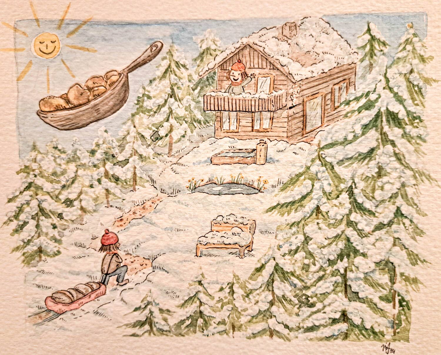 - Bad & WC: Holzbadewanne und Holzwaschbecken, Fön, Handtücher;
