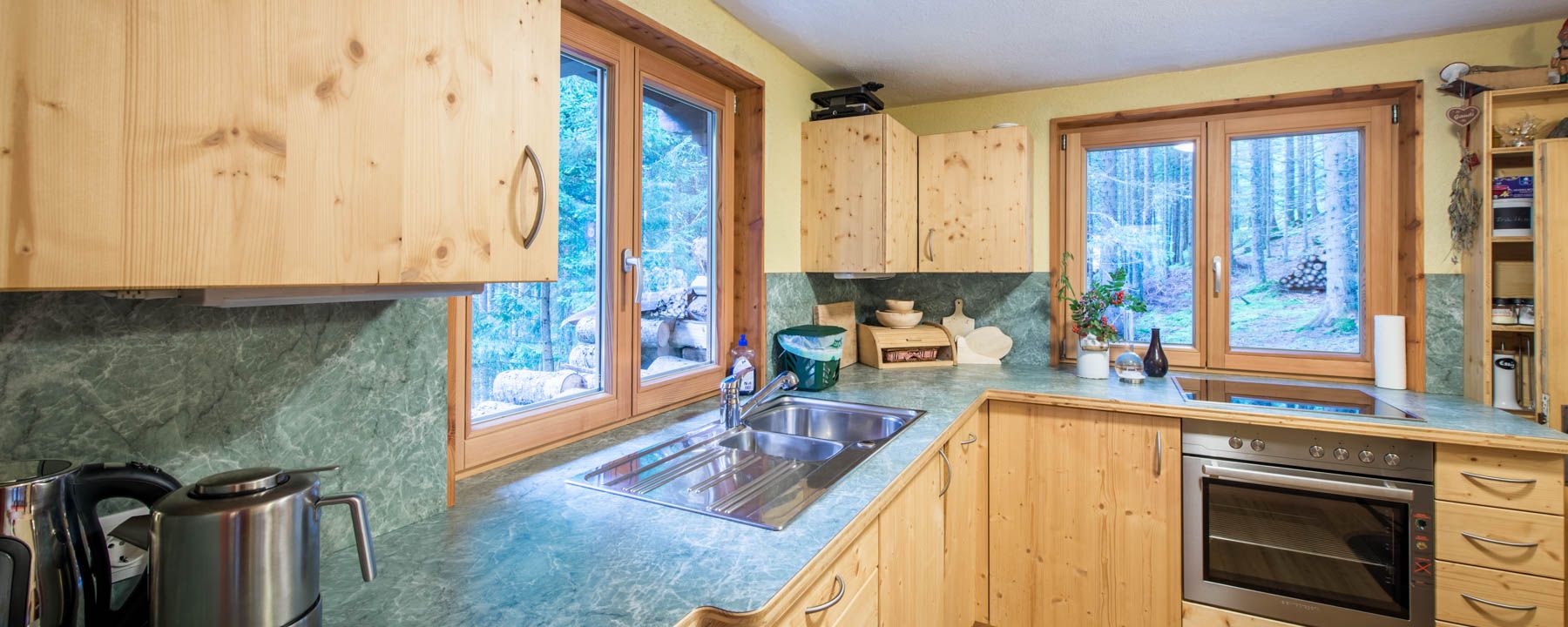 im Sommer zusätzlich Outdoor-Dusche mit Warmwasser - Küche: Vollholzküche mit Bartisch, Elektroherd mit Backofen, Kühl-Gefrierkombination, Geschirrspüler, Raclette, Wasserkocher, Geschirr, Kochutensilien, Thermosflaschen, Bialetti-Espresso-Kocher, Kaffeekanne mit Filter zum Aufbrühen